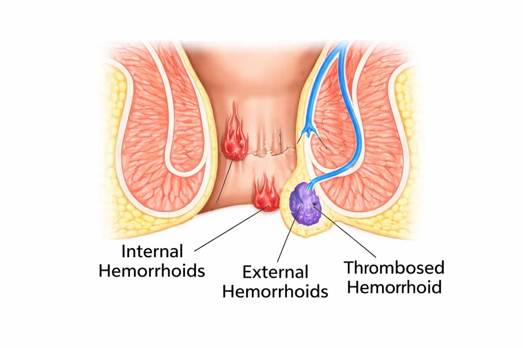 Javljaju se kao oštra bol koju prati krvarenje na izlazu iz debelog crijeva (vanjski) ili dvadesetak centimetara unutar debelog crijeva (unutrašnji).